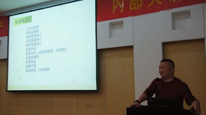 本屆活動(dòng)由運(yùn)營(yíng)管理中心組織。參賽單位由人力行政部、財(cái)務(wù)管理部、營(yíng)銷管理中心、招采管理中心、前研管理中心、金泰華城、金泰華府(含金雀新城、華府南)、金泰舒格蘭、奧晟物業(yè)、啟翔代理、港信裝飾、鴻豐園林11支代表隊(duì)組成。